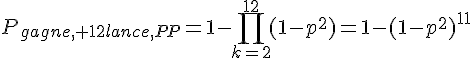 je voudrais connaitre la probabilité sur un pile ou face (avec une pièce non truquée et une pièce truquée à 70 %), d'avoir une fois deux piles consécutifs sur une série de 12 lancés, peut importe le moment dans la série, la série s'arrete au moment ou l'on a le résultat.