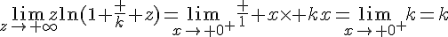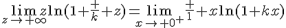 La limite de la fonction g(z) = z ln (1 + k/z ) lorsque z tend vers + infini est égale à la limite de la fonction f lorsque x tend vers 0 car on peut poser z= 1/x et écrire g(z)= f(x)
