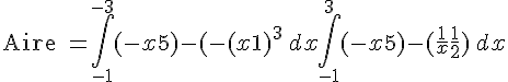 Aire = Intégrale(bornes -1;-3) ((-x+5)-(-(x+1)3) dx + Intégrale(bornes -1;3) (-x+5) - (1/x + 1/2) dx