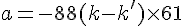 Si on pose l'équation on trouve , en par suite et donc , avec k'' qui parcourt . Maintenant si on fait le calcul on voit que quand on parle de a on parle en fait de -88 et -27 et 34 et 95 etc ce qui s'exprime par a est congru à -88 modulo 61 et a est congru à -27 modulo 61 et a est congru à 34 modulo 61 et a est congru à 95 modulo 61 etc.