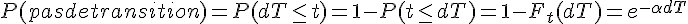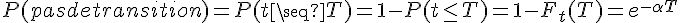 La probabilité qu'il n'y ait pas de transition est donc la probabilité que la durée de vie de mon état soit supérieure à T.