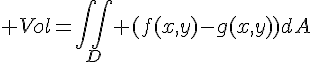Dans mon cours d’intégrales double une propriété dit: "pour calculer le le volume borné par deux surface z=f(x,y) et z=g(x,y) au-dessus de la région D (c'est la région du plan borné par les courbes lisse f et g) on calcule;