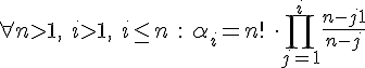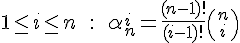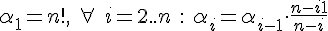- Probablement le point le plus dur : si on regarde uniquement la valeur absolue des coefficients (puisque le signe est déjà géré), on ne voit rien apparaître de probant si ce n'est que le premier coefficient vaut n! et que le dernier vaut 1. C'est là que la mise en tableau des coefficients et l'analyse ligne par ligne de ce tableau (que je ne reproduis pas car je n'ais pas encore cherché les commandes pour faire un tableau) m'ont permis de constater que les coefficients étaient multipliés par une fraction simple.
