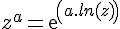 La puissance dont tu parles n'est définie que pour un certains types de nombres complexes : ceux qui appartiennent au domaine de définition d'une certaine determination du logarithme complexe. Dans ce cas là, si z appartient à cet ensemble de définition et si a est un exposant quelconque on pose