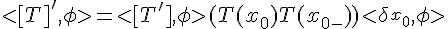 En effet, si on évalue avec une fonction test symétrique, très piquée en x0, on trouve :(en gros j'ai une fonction test très piquée, donc T variera peu sur le support de la fonction test, donc je considère T' à peu près constante de part et d'autre de la discontinuité). En gros on moyenne bien la grandeur T' avec cette définition.