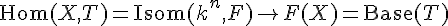Pourquoi prendre k^n? Si je choisis V, n'importe quel espace vectoriel fixé à l'avance de dimension n, et v_i une base de celui ci. Alors j'ai aussi une bijection fonctorielle Isom(V, F)=Base(F) qui à f associe (f(v_1),...,f(v_n)). Ceci est bien sur en totale adéquation avec le fait que le representant d'un foncteur est unique à isom unique pres. Il y a un et un seul isom qui envoie V sur V' en envoyant (v_1,...,v_n) sur (v'1,....,v'n).