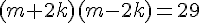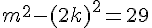 Mais 29 est un nombre premier, donc on a forcément m+2k=29 et m-2k=1
