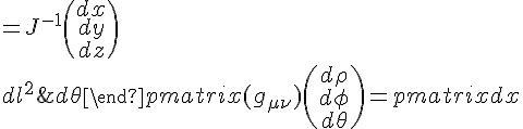 Imaginons qu'on ait une métrique beaucoup plus tordue, avec des termes non diagonaux (bon évidemment, elle est symétrique), ou des fonctions de rho, phi et theta. Si je prends en "sandwich", je vais avoir un mélange de coordonnées puisque les Jacobiens seront des expressions de x, y et z et la métrique des fonctions de rho, phi et theta.