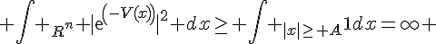 $lim_{|x|\rightarrow \infty}V=-\infty $ donc $lim_{|x|\rightarrow \infty} exp^{-V(x)}=+\infty $ Donc il exist $A\ge 0$ telque si $|x|\ge A$ on a $exp(-V(x))\ge 1$ d'ou $ \int _{R^n} |exp(-V(x))|^2 dx\ge \int _{|x|\ge A}1dx=\infty $ ainsi on a $exp^{-V(x)}$ n'est pas dans $L^2$.