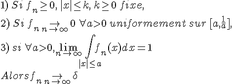 J'ai un théorème de convergence vers Dirac, mais il me semble peu pertinent à utiliser, car les hypothèses utilisées sont sur la fonction sin(nx)/x et non sur la distribution régulière lui étant associée. Je ne vois donc pas comment utiliser l'égalité proposée.