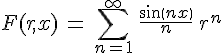 dont tu peux calculer facilement la dérivée par rapport à r. Normalement tu peux en déduire F(r,x). Ce qui t'intéresse, c'est se qui se passe en r=1 ; il faut donc que tu prouves que tu as le droit de faire tendre r vers 1 dans ta somme. Tu peux par exemple montrer, grâce à une majoration de type Abel, que, pour x fixé, ta somme converge uniformément sur [0,1].