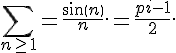 Maintenant on me demande de démontrer que sin(n) /n = (pi-1)/ 2 ( j'ai creusé sur internet et j'ai trouvé qu'il faudrait utiliser la transformation d'Abel) j'ai même trouvé que sin(n)/n = Arctan((x *sin(x)/( 1- x* cos(x))) = (pi-1)/2 . Cependant j'ai rien compris... et le problème est que j'ai jamais entendu parlé de la transformation d'Abel et que ça m'a l'air assez compliqué ) si vous pouviez m'aiguiller un petit peu là dessus j'en serais reconnaissant