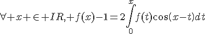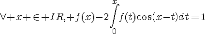 J'ai cherché une équation différentielle vérifiée par f. On sait seulement qu'elle est continue mais il me semble que la présence de l'intégrale permet en écrivant l'égalité sous la formede montrer que f est aussi dérivable, parce que l'intégrale dépendant de x l'est aussi. Mais alors dans ce cas quand on écrit dans le cas général