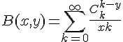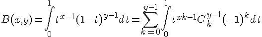 J'ajoute que la première définition de B(x,y) par intégrale a un sens pour tout x et y complexes avec Re x>0 et Re y>0, alors que la deuxième définition par série a un sens pour tout x et y complexes avec x distinct des entiers négatifs et Re y>0. L'égalité entre ces deux définitions fait sens sur le plus petit domaine commun: Re x>0 et Re y>0 (la deuxième définition donne un prolongement analytique en x de la première définition. En fait, la fonction beta admet un prolongement analytique à tout x,y complexes avec x et y distincts des entiers négatifs).