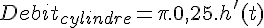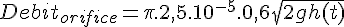La formule de Toricelli donne la vitesse d'écoulement d'eau par l'orifice : v(t) = 0,6*racine (2*g*h(t)) où v(t) est la vitesse d'écoulement de l'eau en m/s et h(t) la hauteur de l'eau dans le reservoir.