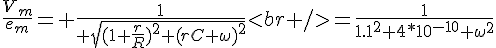 Apres j'ai trouvé V=(E*(R/1+Rjcw)) / (r+(R/1+Rjcw)) et donc V=(em*R)/(r(1+Rcw)+R), en effet on a un diviseur de tension