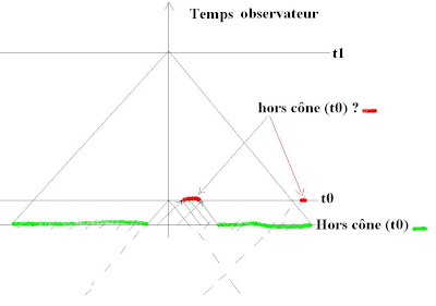 Hors c'est faux ! En effet dans le passé e0 était causalement lié à un cône plus grand, dont les éléments ont pu, suivant leur propre cône de lumière futur, se lier causalement aux élements extérieurs au cône de e0.