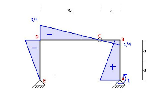 Je suis retombé sur un vieux livre de mécanique des structures où je prends plaisir à refaire des calculs d’hyperstaticités à la main. Or je suis tombé sur un petit soucis lors d’une réduction à un système isostatique : celui de la détermination des diagrammes de moment pour un moment unitaire en A. En fait, j’ai du mal à comprendre pourquoi la valeur en B vaut 1/4 . Instinctivement, j’aurais mis 1/3 du fait de la longueur entre A et la rotule C.