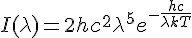 I( "lambda",T)=2hc^2/"lambda"^5*exp(-hc/("lambda"kT))