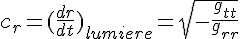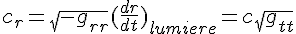 Cr est la vitesse coordonnée de la lumière pour un observateur O à l'oo. C est la vitesse locale (je dirais même propre sans vouloir déclencher de polémique c'est juste une question sur la pertinence de l'utilisation de ce terme dans le cas présent) de la lumière.