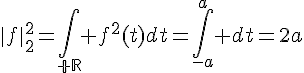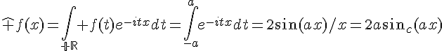 Prenons a un réel strictement positif quelconque et soit f la fonction valant 1 sur [-a, a] et 0 ailleurs (il est clair que si je prend la fonction vallant une constant positive arbitraire b sur [-a, a] et 0 ailleurs alors son intégrale au carré sera multipliée par b² de meme que sa transformée de Fourier sera multipliée par b et l'integrale du carré de cette derniere par b² de sorte qu'on peut prendre b=1).
