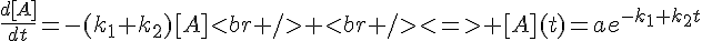 , sachant qu'à l'instant initial [A]=a, [B]=0 et [C]=0. En déduire les expressions de [A], [B] et [C] ,au début de la réaction, en fonction du temps t et des constantes de vitesse k1 et k2. Calculer la valeur du rapport [B]/[C]. En déduire les valeurs approximatives de [A], [B] et [C] à l'instant t=4min.»