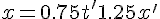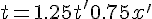 Dans le référentiel du quai, ces évènements ont d'autres coordonnées, que l'on va calculer par transformation de Lorentz en supposant que le train se déplace vers les x positifs avec une vitesse V=0.6c. Les transformations de Lorentz s'écrivent alors :