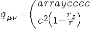 Je sais qu'un simple changement de coordonnées de rho, phi et theta vers leurs valeurs en x,y,z n'est pas permis. Outre les raisons mathématiques qui m'échappent, la preuve est assez simple, puisque le 3ème élément de la matrice serait transformé en x^2+y^2+z^2. Or, à la limite pour r grand, on doit tendre vers la métrique plate de Minkowski.