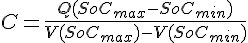 Pour mon doute sur la valeur de C, il provient de l'équation. Le numérateur peut-être considéré comme équivalent à Q dans tous les cas. Par contre, le dénominateur (Voltage de la batterie à son état de charge max - voltage à l'état de charge min) me semble trop petit, on arrive a des valeurs en Farad trop élevées pour une batterie (qui est plutôt aux alentours des 5kF), mais bon ca ne résoud pas le problème.