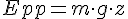 L'énergie potentielle de pesanteur étantoù z est l'altitude, g l'intensité du champ de pesanteur 9.81 sur terre et m la masse d'un objet. Le résultat est en Joules.