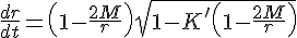 Auparavant nous nous intéressions à la vitesse coordonnée dr/dT (T=tau, le temps propre de celui qui chute). Cette fois la vitesse, toujours coordonnée (aucune n'est une vitesse locale), est celle dans le repère de Schwarzschild soit dr/dt (t=temps propre de l'observateur à l'infini). C'est toujours la "pente" de la trajectoire recherchée. La question est donc :
