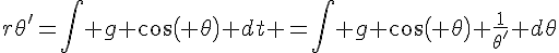 L'équation différentielle que j'obtiens pour la première question est θ'' = (g/r)cosθ, sachant que θ dépend de t. J'intègre donc l'expression pour avoir θ' et ensuite calculer Vg (r×θ). θ' c'est l'intégrale de (g/r)cosθ, ce qui donne : θ' = gcosθ/(rθ')+C, puisque θ' dépend de t. Alors θ'^2 = gcosθ/r + C, ça c'est mon raisonnement apparemment incorrect, j'aimerais savoir pourquoi. De plus, l'indice ne m'aide pas. Merci d'avance