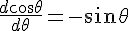 Bonsoir, j'ai une question sur une notion qui me perturbe. Ma question est quand est ce que l'on peut considérer que la dérivée de cos(θ)= -sin(θ)*dθ et quand est ce que l'on peut considérer que c'est juste -sin(θ) ? C'est juste un exemple. En maths la dérivée de x c'est toujours 1 donc je n'ai pas ce problème mais en physique je ne comprends jamais quel est la raison. Sauriez-vous m'expliquer ce que je dois faire en fonction des cas ?