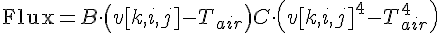 v[k+1, i, j] = v[k, i, j] + A * (v[k, i+1, j] + v[k, i-1, j] + v[k, i, j+1] + v[k, i, j-1]) / 4 - (B * (v[k, i, j] - T_air2) + C * (v[k, i, j]**4 - T_air2**4))