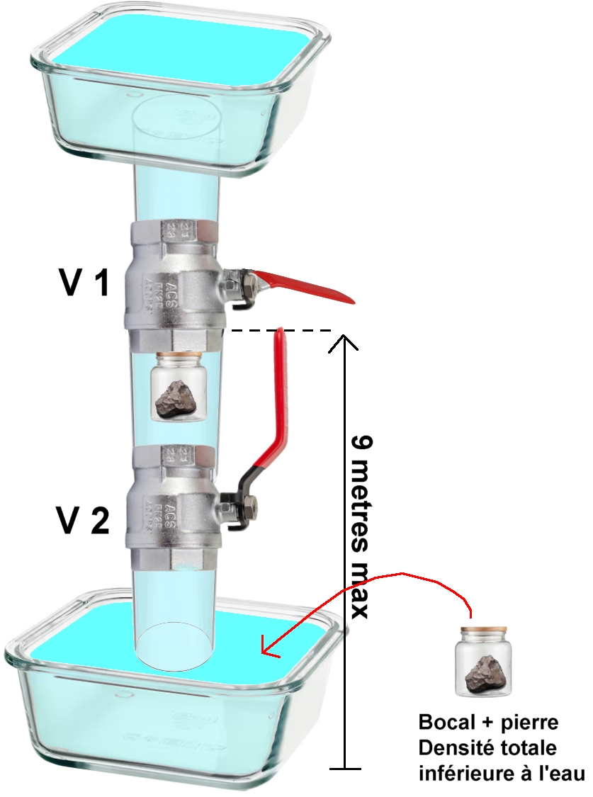 Ce montage sert a remonter des pierres attachées à des morceaux de bois dans un long tube vertical rempli d'eau.