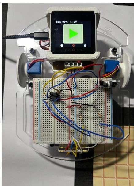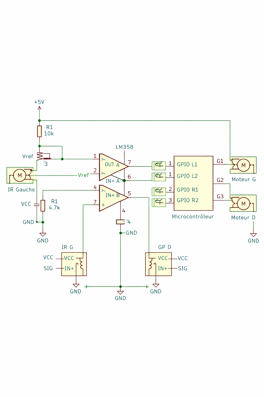 Voici le bout de texte : Pour finir, notre but est de concevoir le “cerveau” de notre montage à l’aide d’un comparateur LM358 qui permet de comparer de façon indépendante les deux photorésistances PR1 et PR2 à une tension de référence qui est modélisée par un potentiomètre de 10 kΩ qui est une résistance réglable où l'on va placer le curseur au milieu pour avoir 5 kΩ de chaque côté. On aurait aussi pu choisir d’utiliser la méthode du pont diviseur de tension comme tension de référence. Notre but avec ce comparateur est d’avoir une tension aux bornes du potentiomètre qui est la même que celle du comparateur pour qu’il y ait une action du robot. On veut que lorsque le robot voit du blanc, la tension soit d’environ 3,6 V, donc supérieure à 2,5 V, et quand il voit du noir, inférieure à 2,5 V, donc environ 0,6 V. Étant donné que les yeux du robot sont de chaque côté de la ligne noire. Dès qu’un des yeux : droite ou gauche, verra du noir, la tension va baisser drastiquement et le robot se tournera à droite ou à gauche pour retrouver cette tension et continuer à avancer. On modélise cet objectif par le montage ci-dessous.