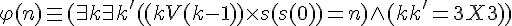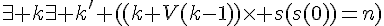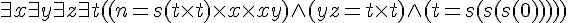 Sans latex donc, ma formule dit : "il existe p,q,r,m,k tels que : (n=k.p.q+r) et (q=r+m+s(0)) et (q=k.k.s(k.k)) et (k=s(s(0)))"