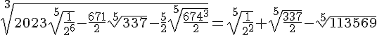 \sqrt[3]{2023\sqrt[5]{\frac{1}{2^{6}}}-\frac{671}{2}\sqrt[5]{337}-\frac{5}{2}\sqrt[5]{\frac{674^{3}}{2}}}=\sqrt[5]{\frac{1}{2^{2}}}+\sqrt[5]{\frac{337}{2}}-\sqrt[5]{113569}